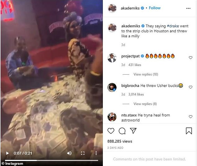 In a series of posts that were reportedly created last week and now deleted from the club, Drake can be seen surrounded by plenty of dancers and cash as he parties away in Houston.