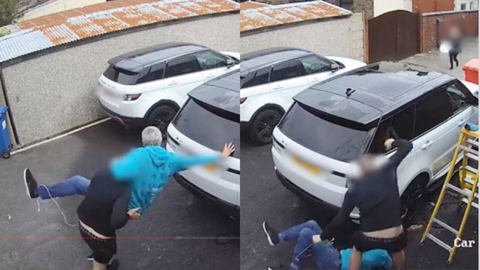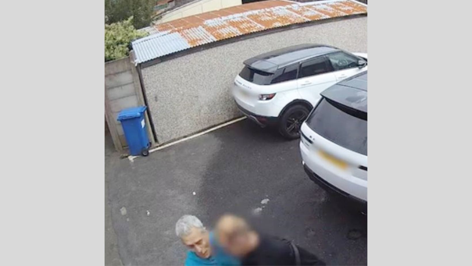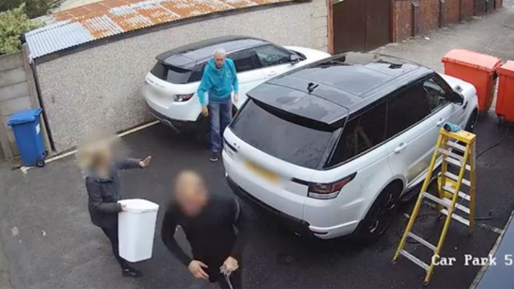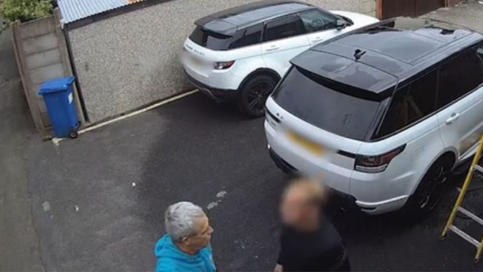 Graham Hope, 64, was cleaning his Range Rover before he was approached by a man. The CCTV footage shows a man dressed in a black top and shorts came up to Graham and the pair can be seen having a conversation.