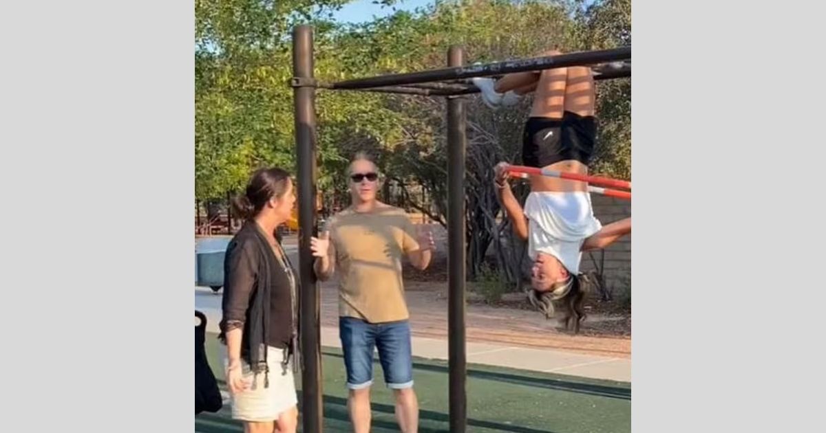 Kehayova was wearing a white tank top and running shorts at the park, and the reason her sports bra showed was that she was hanging upside down.