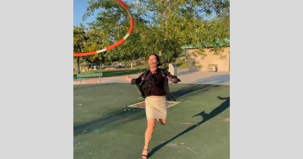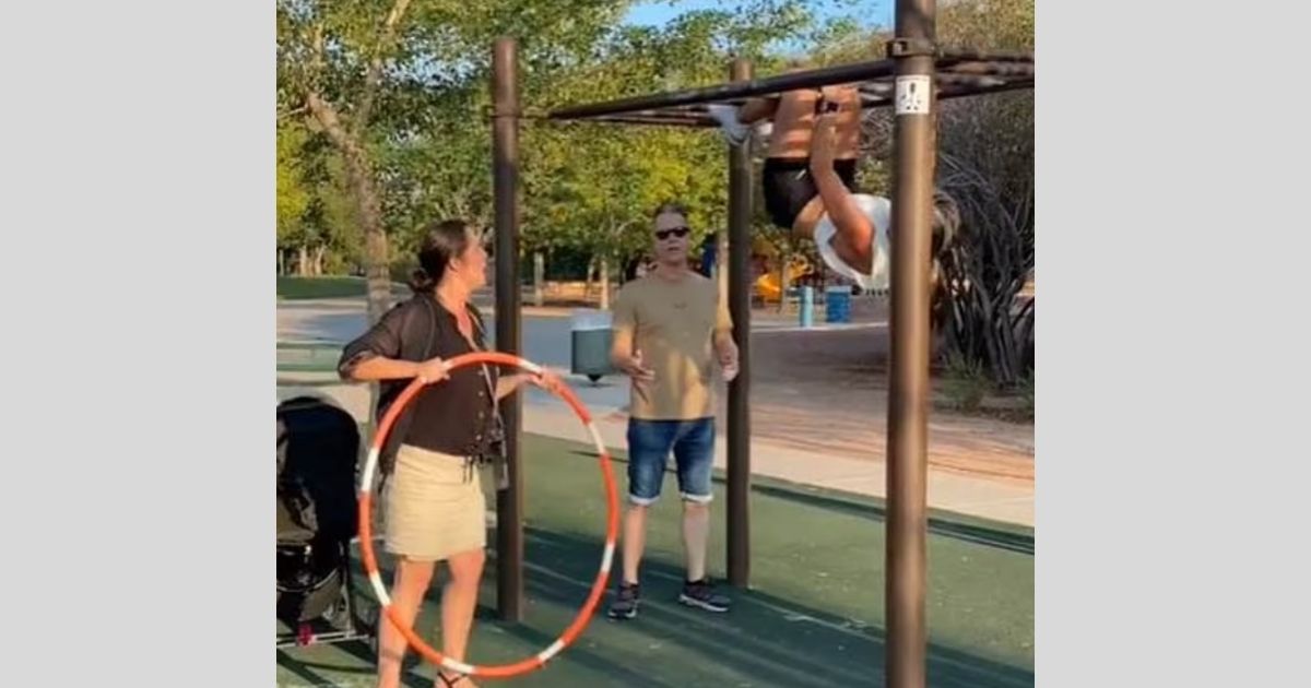 Getti Kehayova, a 43-year-old hula hoop world champion from Las Vegas, Nevada, was hanging upside down from a monkey bar and hula hooping when her shirt slipped down.