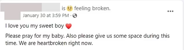 “I love you my sweet boy. Please pray for my baby. Also please give us some space during this time. We are heartbroken right now,” she wrote.