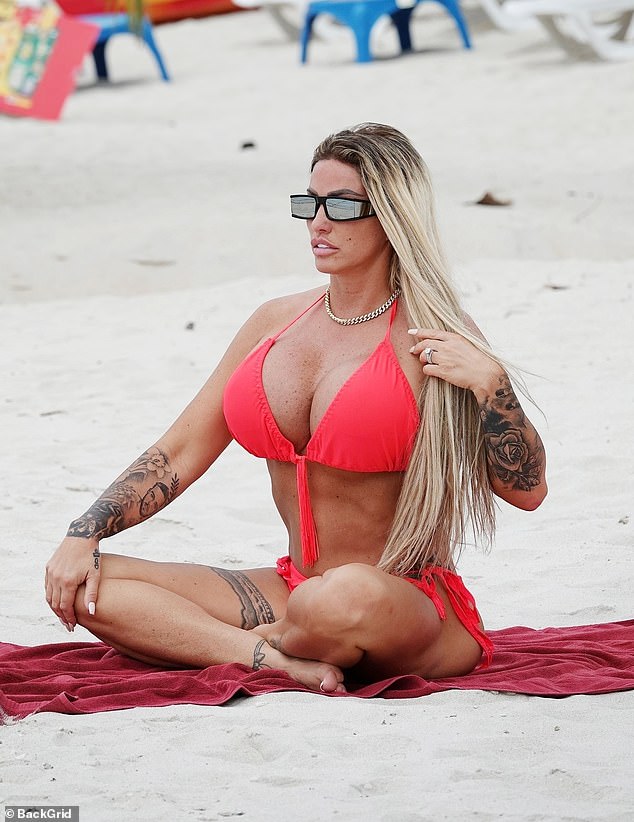 In a new series of images, Katie can be seen posing in skimpy swimwear. Her new giant breasts hardly fit into the skimpy attire.