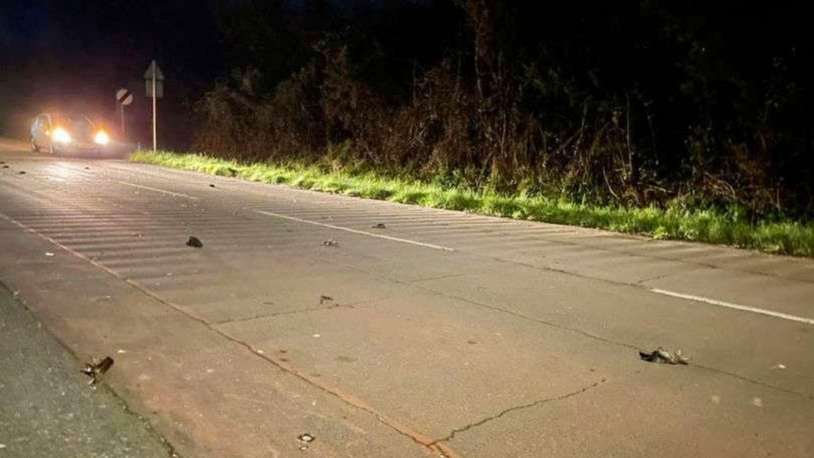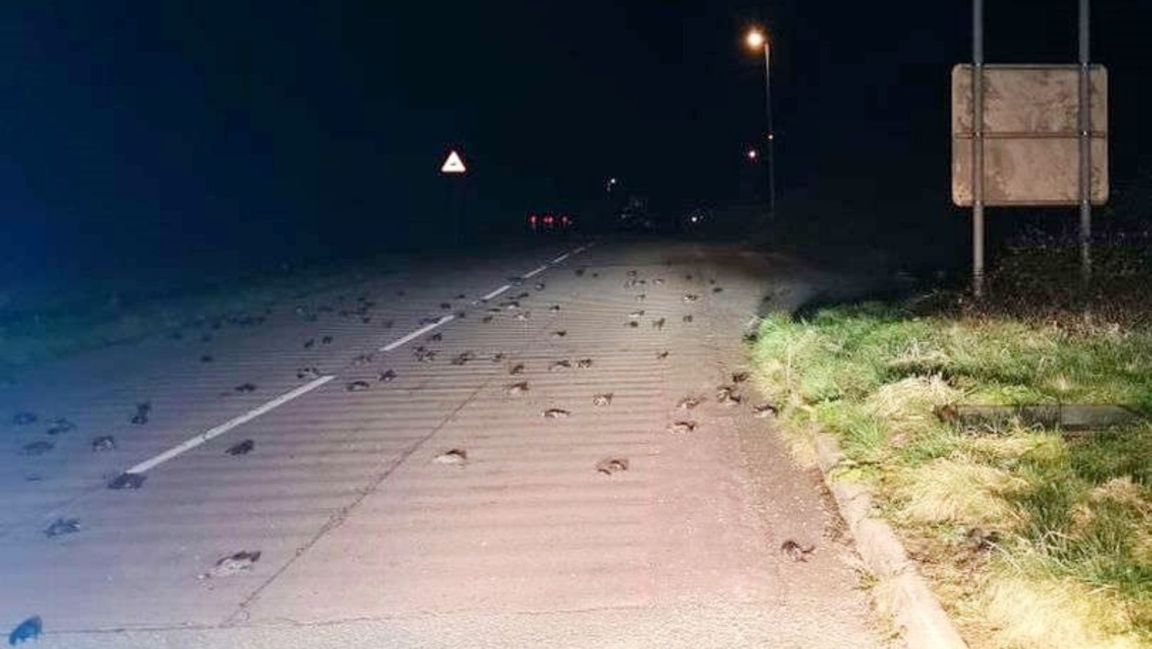 Claire Eaton, who lives close to the road, went out at 11 pm and said it was “traumatic” to see. She thought the birds had “died on impact” and even managed to scoop one of the stunned birds up and take it home, still alive. She is planning to release it later today.