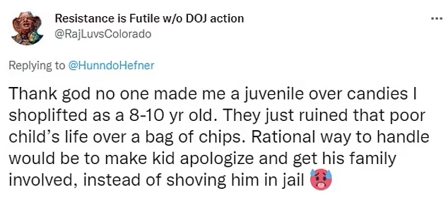 The third suggested: “Thank god no one made me a juvenile over candies I shoplifted as a 8-10 year old. They just ruined that poor child’s life over a bag of chips. Rational way to handle would be to make kid apologize and get his family involved, instead of shoving him in jail.”