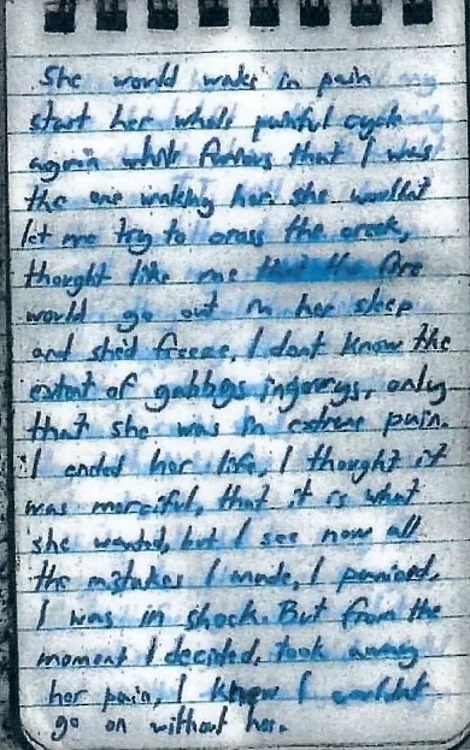 “I ended her life. I thought it was merciful, that it is what she wanted, but I see now all the mistake that I made. I panicked. I was in shock. But from the moment I decided, took away her pain.”