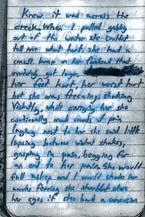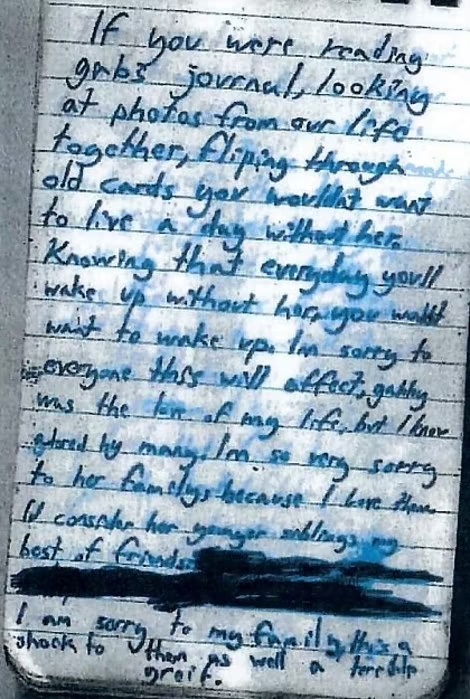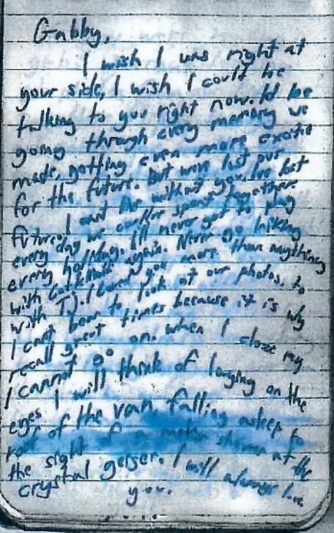 “I wish I could be at your side, I wish I could be talking to you right now,” the 23-year-old began in the water-logged pages of his diary as he referred to Gabby.