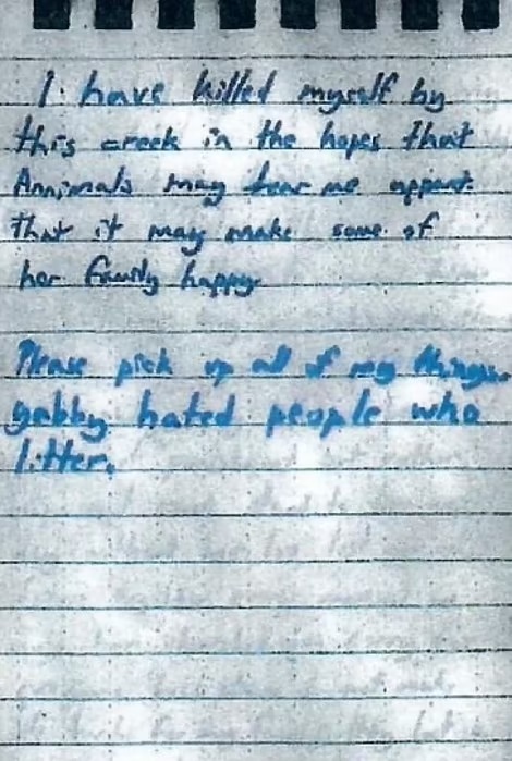 “I have killed myself by this creek in the hope that animals may tear me apart that it might make some of her family happy,” Laundrie said.