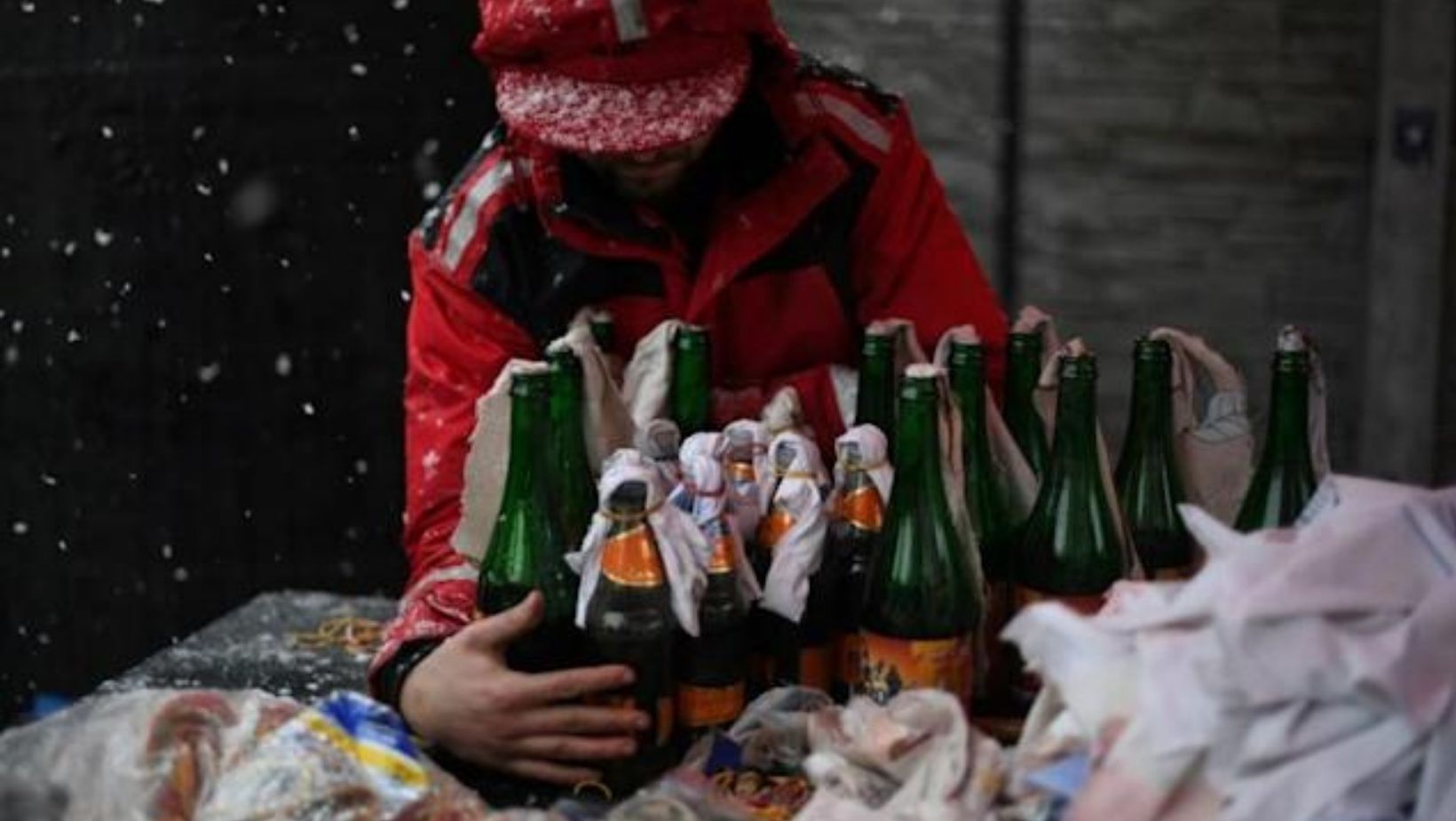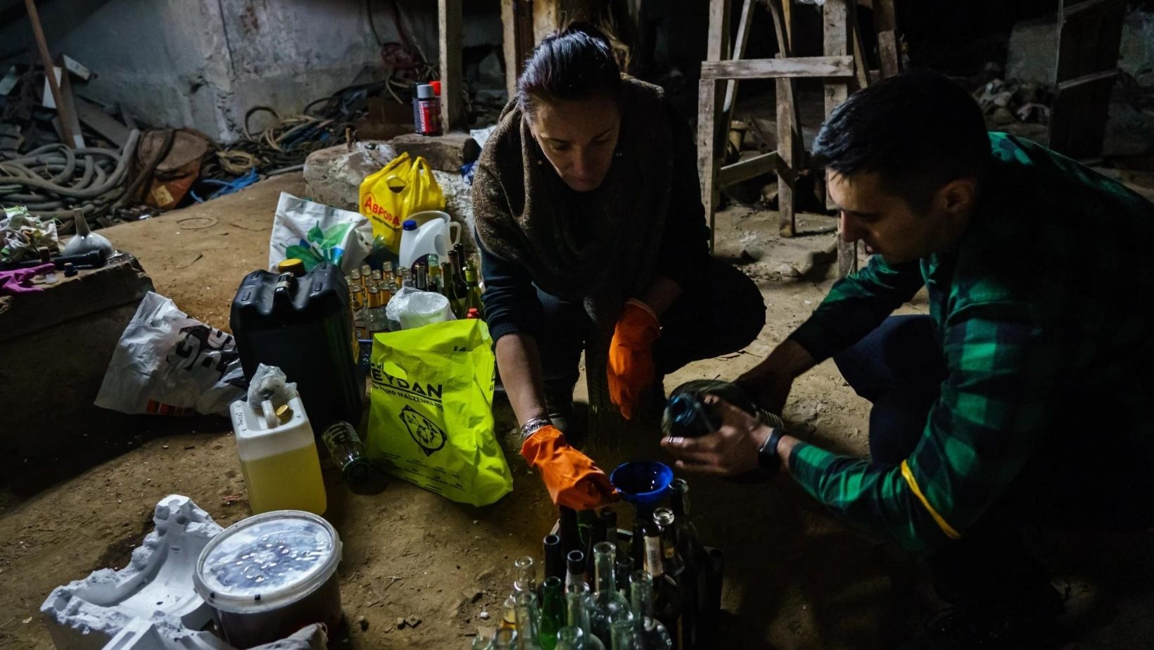 Olga and a second woman crush the Styrofoam, while a man and woman to their side carefully poured fuel and oil into a funnel, oozing the mix into the bottles. Next to them, a man dipped the wicks in shredded pieces of tablecloths and curtains before wrapping the heads with bits of twine.