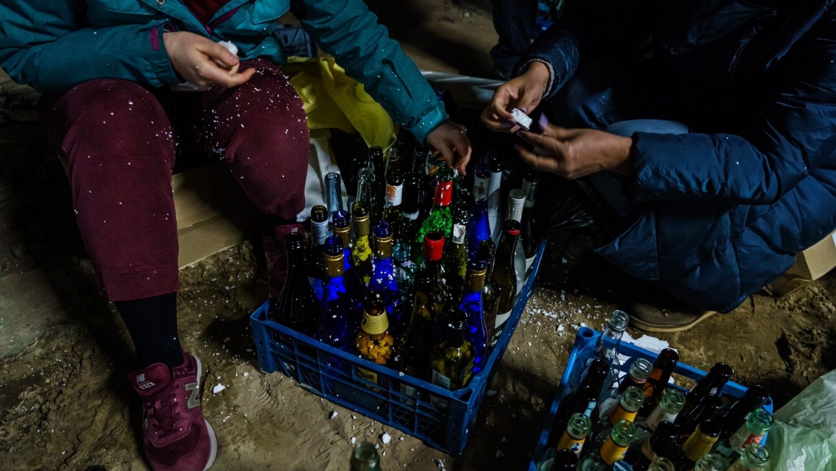 She crumbled chunks of Styrofoam, coaxing the white pebbles from her hand into bottles of sangria mix, Beefeater gin, and beer and wine laid out in front of her.