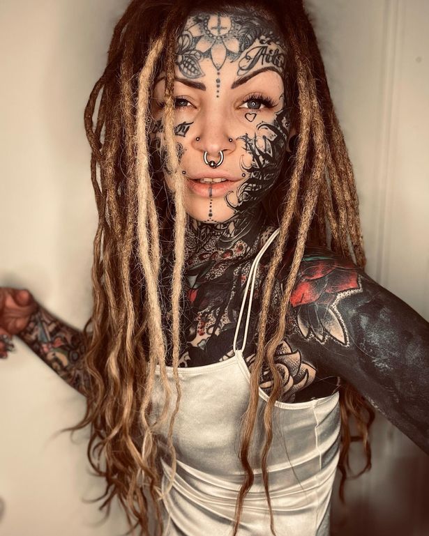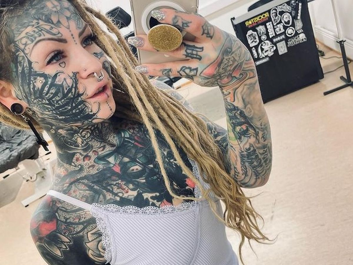 A mother who is covered in tattoos is going viral after opting to ditch her clothing.