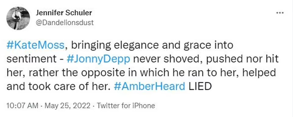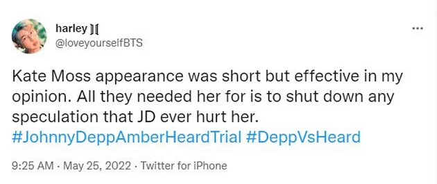 Twitter user @busyxxchick said: “Kate Moss testified in like 4 minutes debunked years of Amber Heard’s rumor about Johnny pushing her down the stairs.”