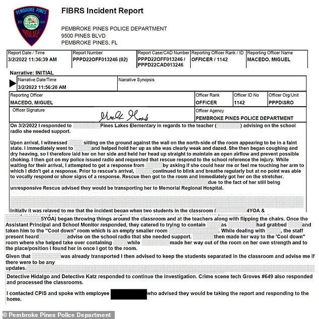 By the time the paramedics squad arrived at the Pines Lakes Elementary school for assistance, the teacher had become unconscious and needed immediate medical attention.