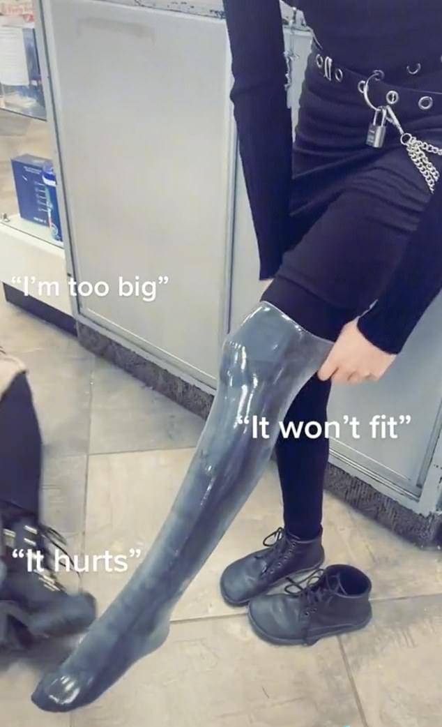 The woman’s friend starts capturing a video that shows her wearing a condom over her entire leg, covering her tight, and then going up to her knees.