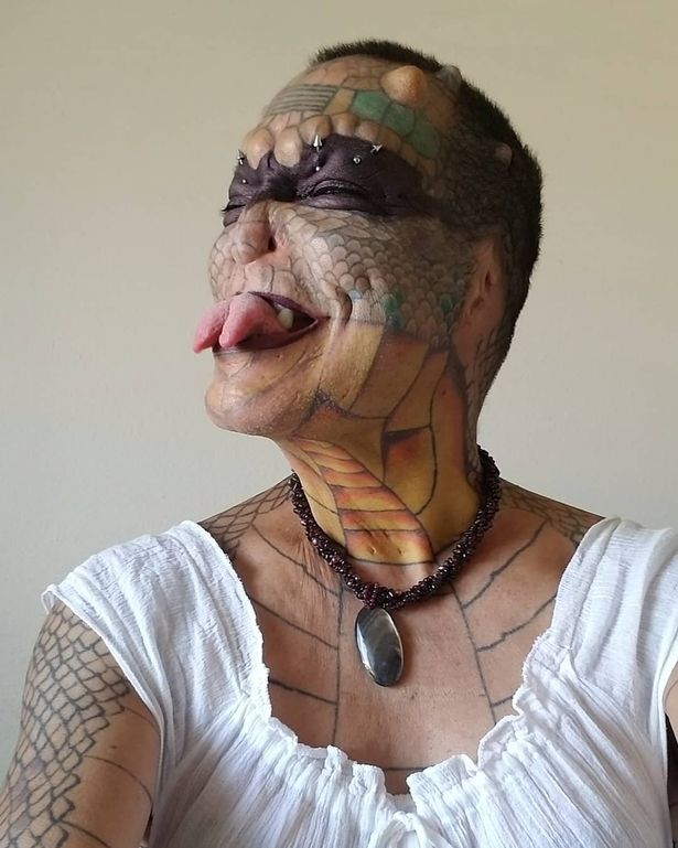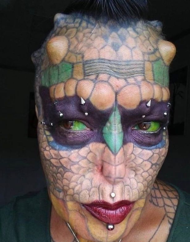 A former banker has undergone a radical transformation to form a dragon lady, complete with scales and a split tongue.