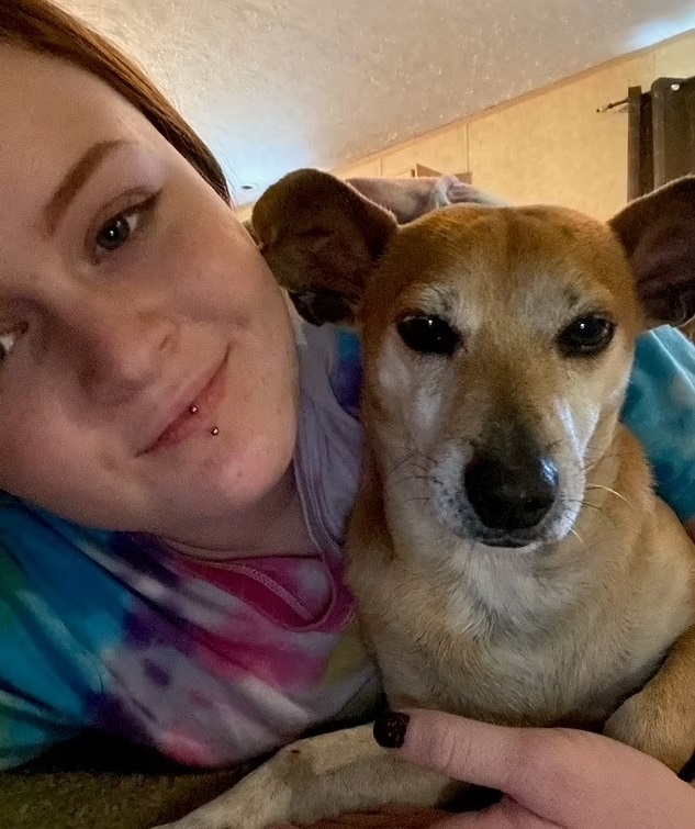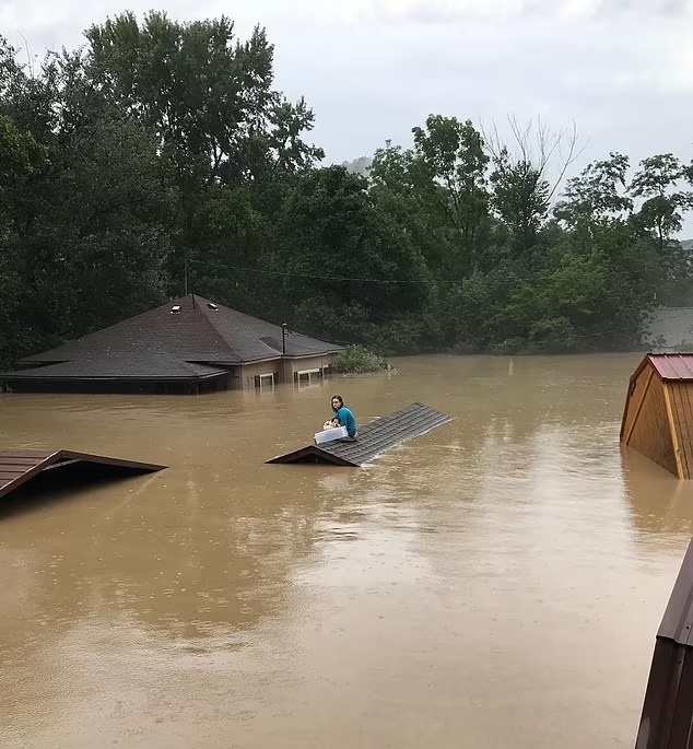 After “disastrous” floodwater filled up her home in Whitesburg, quick-thinking Chloe put her dog Sandy in a plastic container and made a desperate bid to save her life by swimming to her neighbor’s home and climbing on top of its roof together with her beloved companion.