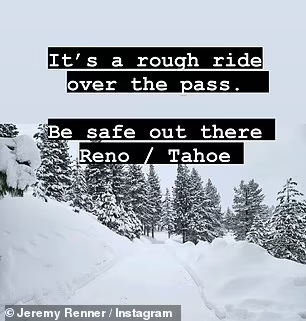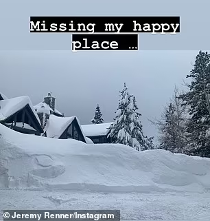 Taking to Instagram on Monday, he shared two photos from Nevada – one a photo of a road covered in deep snow as he warned people to ‘be safe’ and another showing snow-covered rooftops along with a message saying he missed his ‘happy place.’