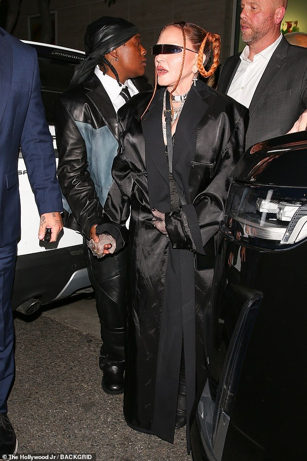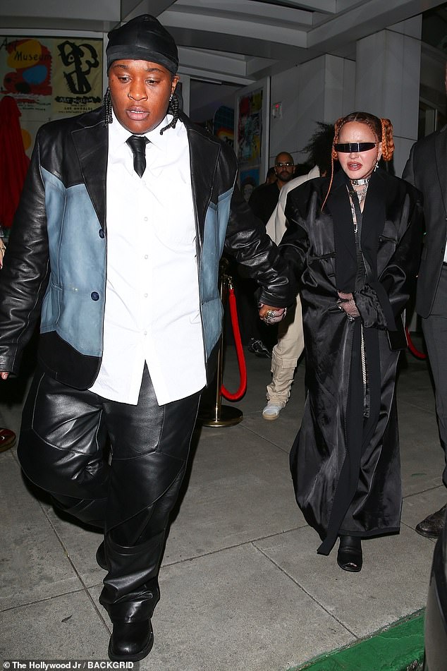 Madonna chose to arrive dressed head to toe in the hue black. And her look comprised a chic black colored silk coat with some quirky shades.