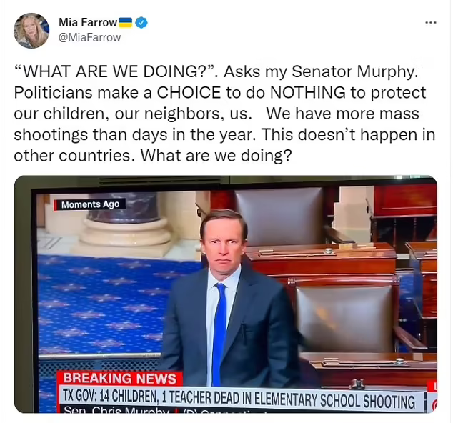 Actress Mia Farrow also tweeted: ‘“WHAT ARE WE DOING?’. Asks my Senator Murphy. Politicians make a CHOICE to do NOTHING to protect our children, our neighbors, us. We have more mass shootings than days in the year. This doesn’t happen in other countries. What are we doing?”