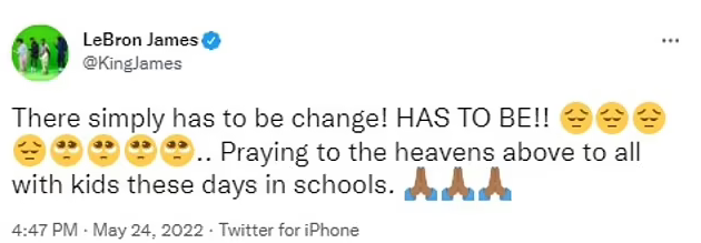 The Lakers star took to Twitter and responded to reports that children and two adults had been killed at Robb Elementary School in Uvalte after an 18-year-old gunman opened fire.