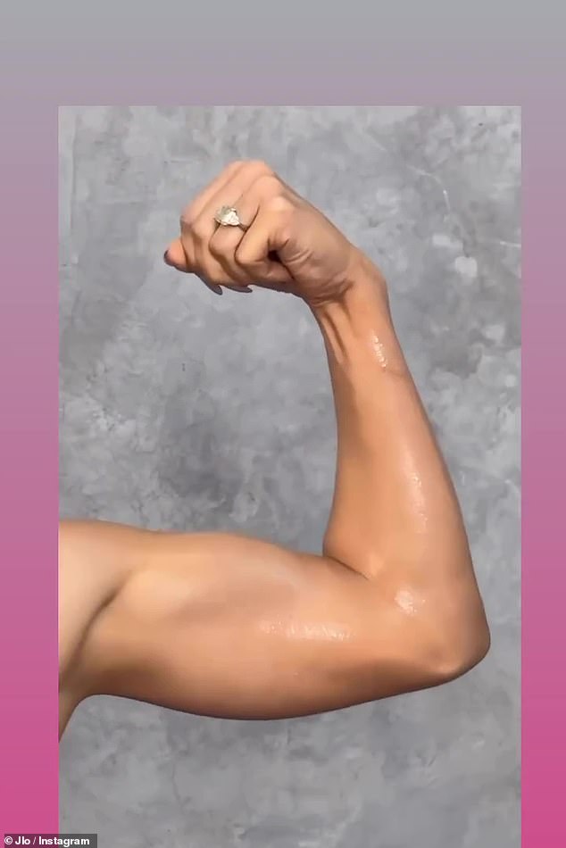 The camera can then be seen switching over to her powerful biceps which JLo flexes magically to showcase how hard she’s been pumping up a sweat at the gym.
