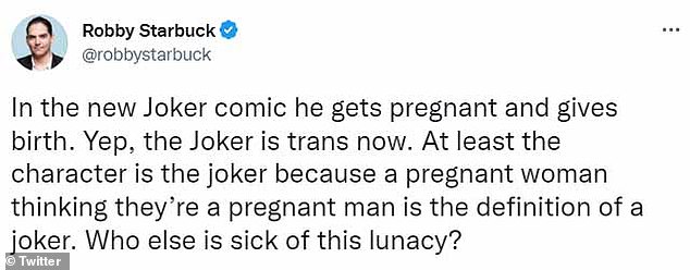 “Who else is sick of this behavior? I mean, he’s batman’s villain and a male who is pregnant! Can anyone else agree with me about this being so twisted!”- mentioned one outraged man.