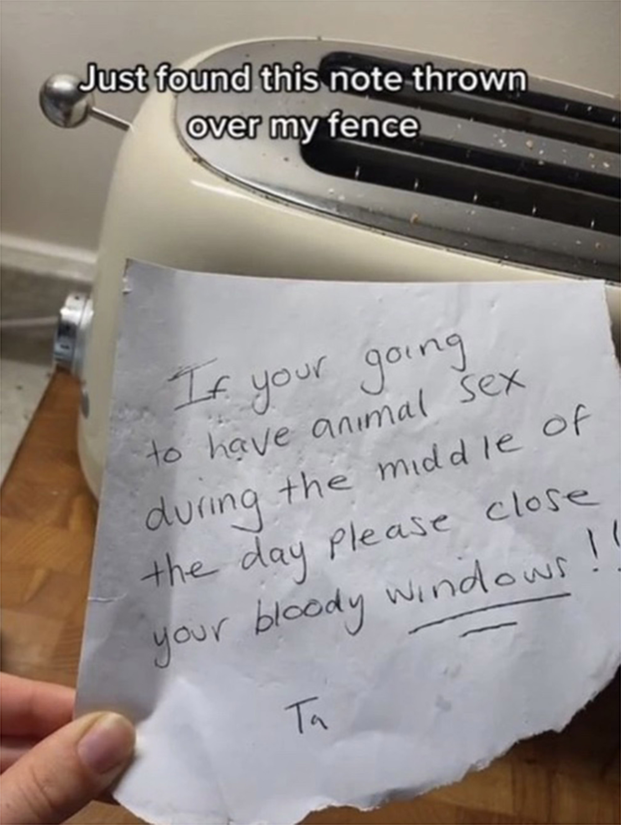 “If you plan on having wild and crazy animal s*x during the day, well, then you better close your windows”- the note read. As you can tell, anybody would have been embarrassed by something like that!
