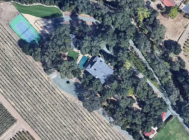 The property, which features a tennis court, sits on the banks of the Napa River.