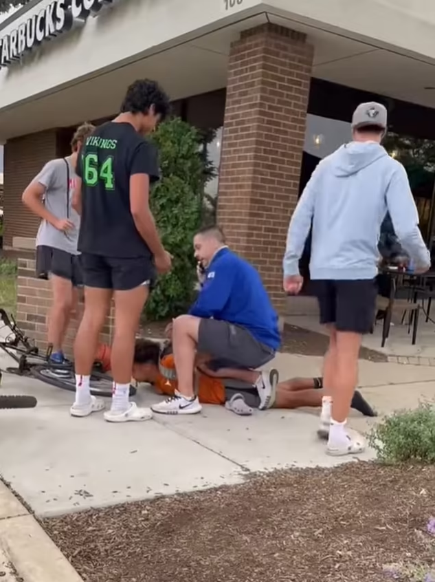 The video starts with the cop on top of the Puerto Rican, who was at Starbucks with his friends when they spotted an abandoned bicycle on the ground.