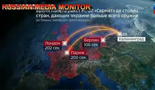 On another occasion, Russian state TV showed disturbing graphics as propagandists deliberated nuking several European cities.