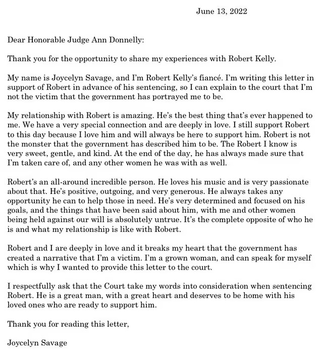 “My name is Joycelyn Savage, and I’m Robert Kelly’s fianće. I’m writing this letter in support of Robert in advance of his sentencing, so I can explain to the court that I’m not the victim that the government has portrayed me to be,” Joycelyn Savage claimed in a June 12 letter to Judge Ann Donnelly.