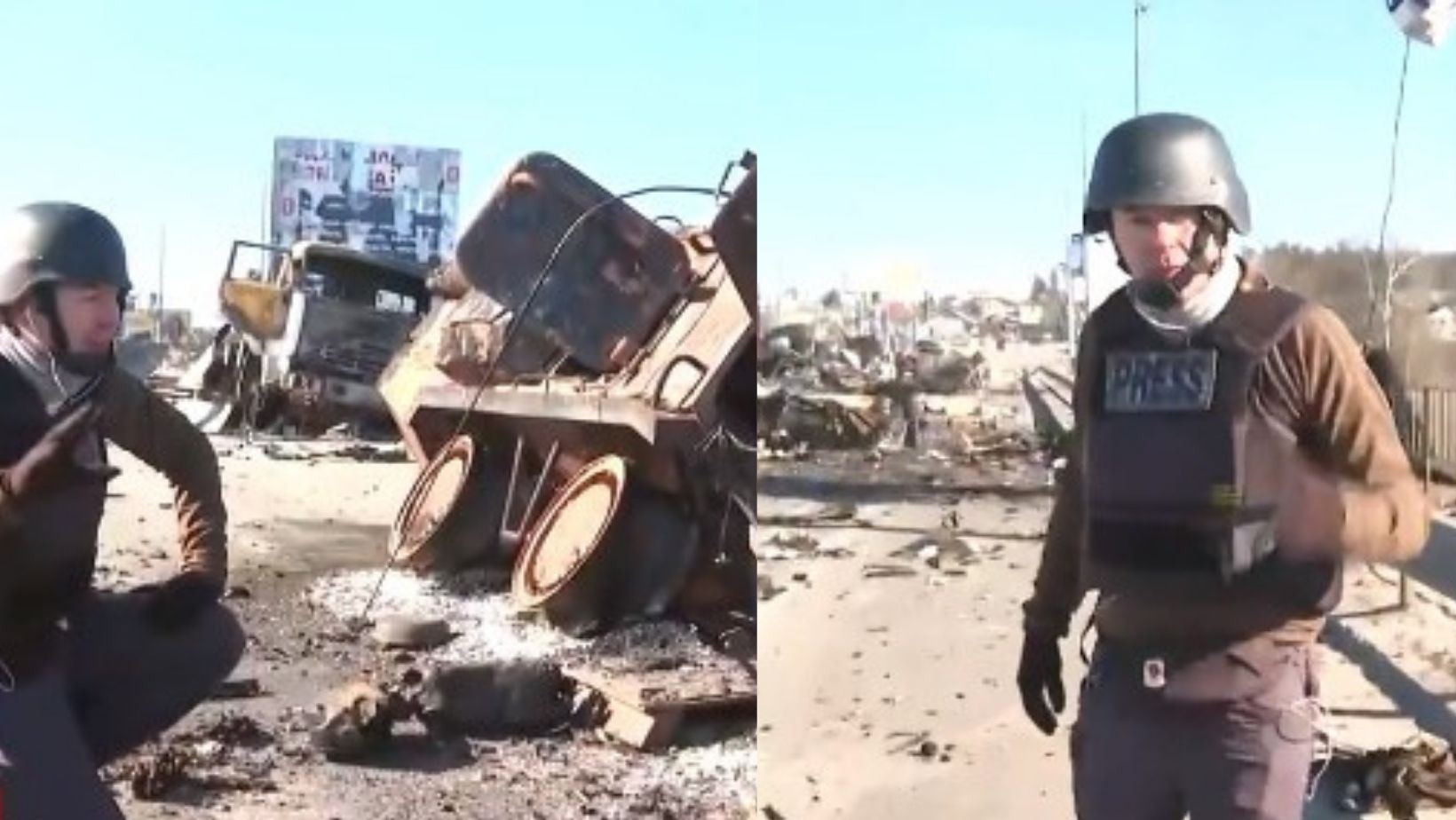He said: “Oh actually — I was crouching down right by a grenade. I didn’t see that, so let’s move away from that,” backing farther away before smoothly continuing his report about the Ukrainian resistance against Russian troops there earlier.
