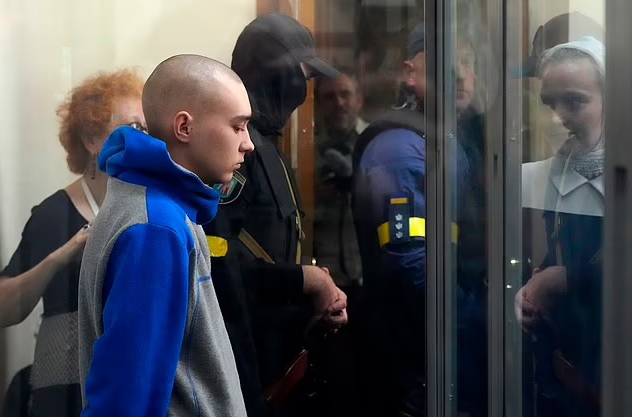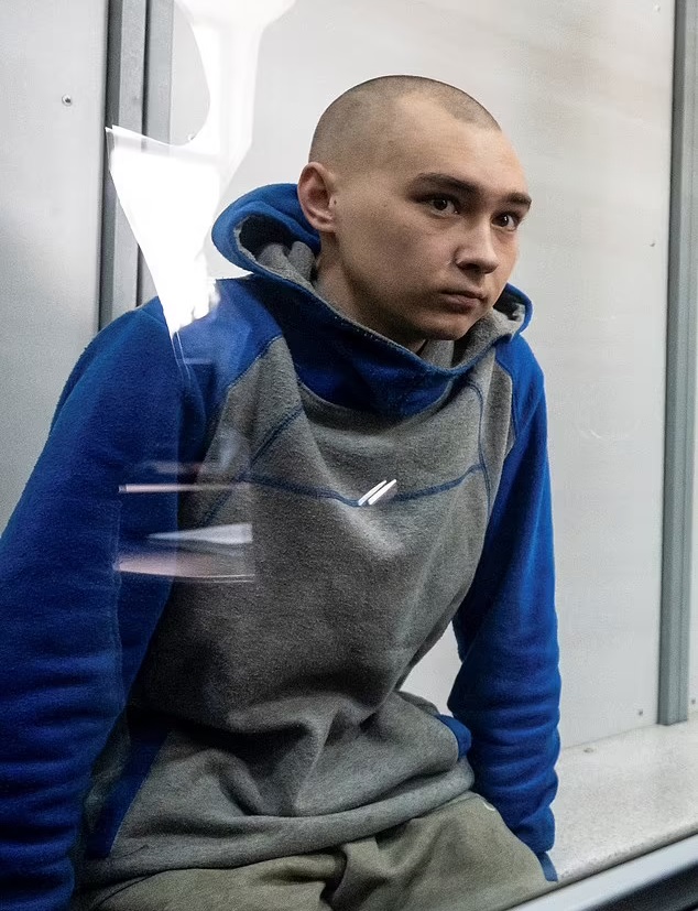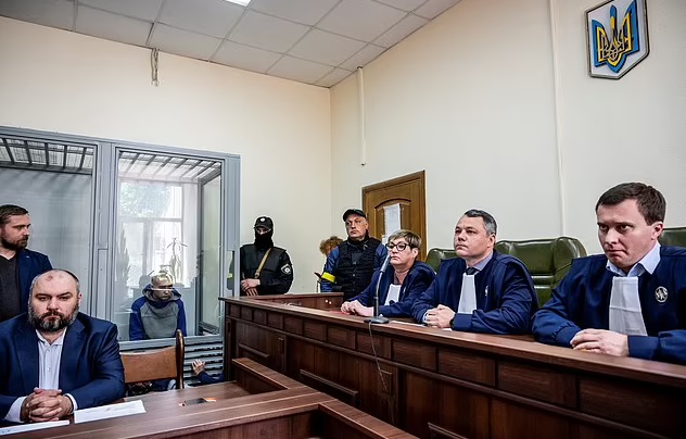 The soldier has since been arrested and brought to court in Solomyanskyy, Kyiv, where he was placed in a glass cage while reporters rallied at the courthouse to witness the historic moment.