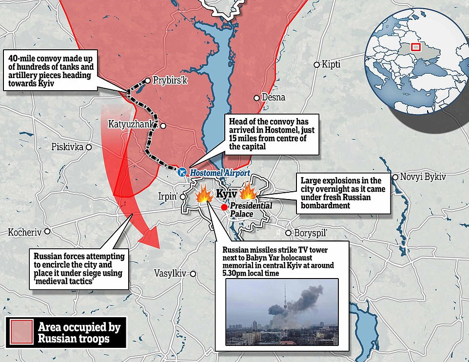According to local media reports, a 40 mile long deadly Russian convoy is reportedly parked and on standby as Ukrainian officials feel they have arrived to batter the capital and take complete control via artillery fire.