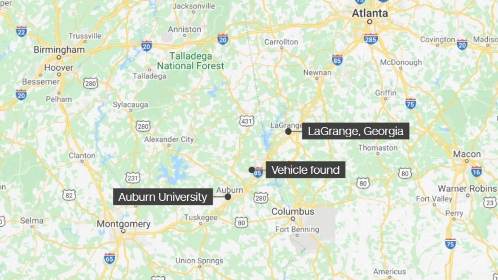 Sheriff James Woodruff, from Troup County, Georgia, told a news conference that Clinkscales’s white Ford Pinto was found in an Alabama creek.