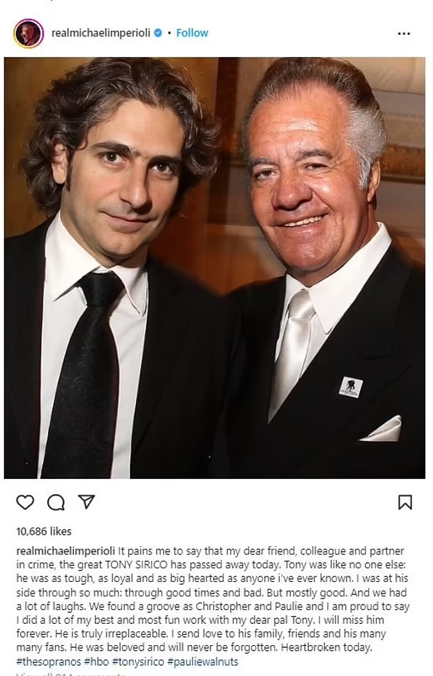 His devastated co-star Michael Imperioli, 56, shared the heartbreaking news on Instagram, along with a photo of them together.