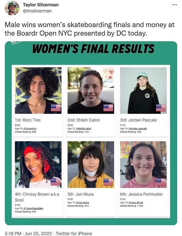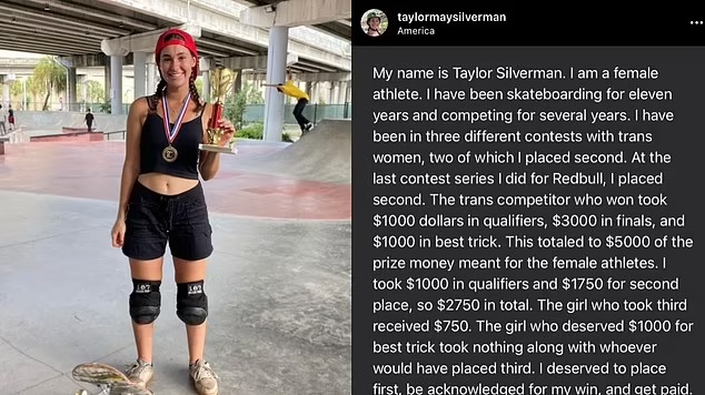 Lashing out at the outcome was Taylor Silverman, a fellow skateboarder who allegedly lost first place to trans competitors on several occasions.