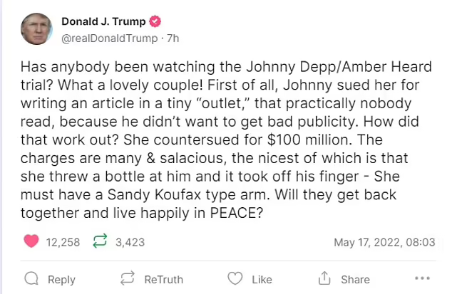 The former US president has weighed in on Amber Heard and Johnny Depp trial as he mockingly called the pair a lovely couple.