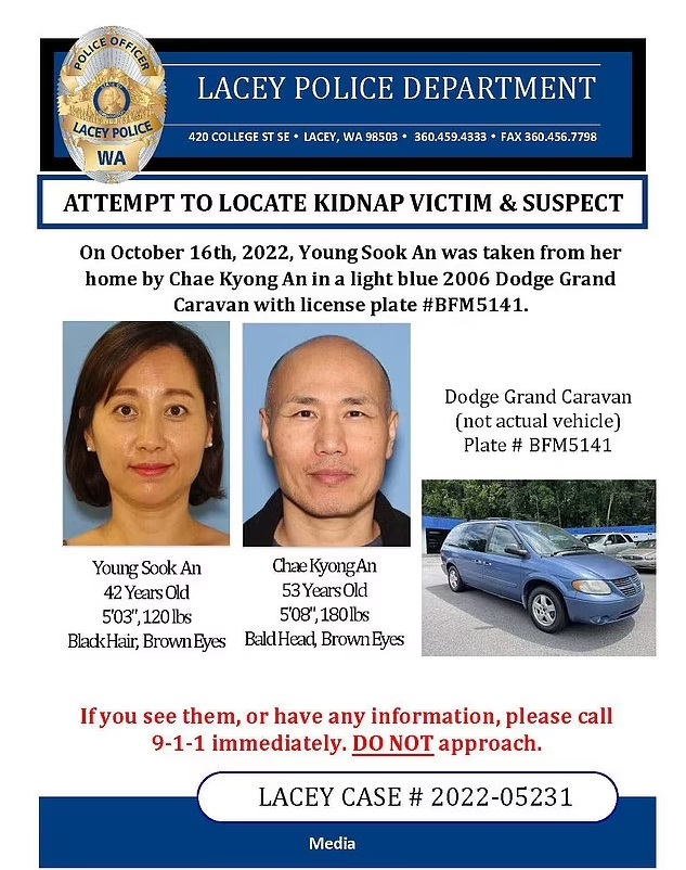42-year-old Young Sook An from the Washington suburb of Lacey, some 60 miles from Seattle, was snatched from her home last Sunday by her estranged husband Chae Kyong An.