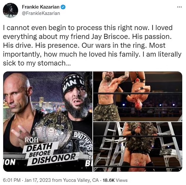 “I cannot even begin to process this right now. I loved everything about my friend Jay Briscoe. His passion. His drive. His presence. Our wars in the ring. Most importantly, how much he loved his family. I am literally sick to my stomach,” Frankie Kazarian added.