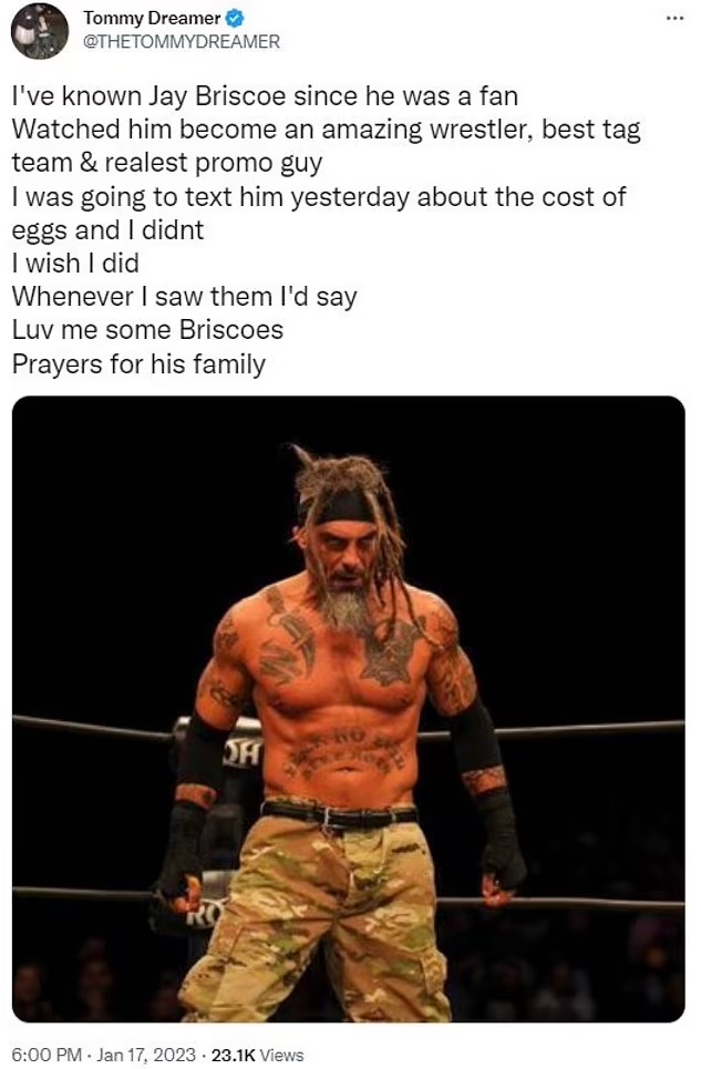 The tragic news was announced by All Elite Wrestling President Tony Khan who recalled the wrestler’s successful career as he shared his sympathies with his family, including Jay’s tag team member and brother Mark Briscoe.