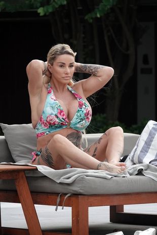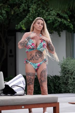 Katie also matched her swimming outfit with white shoes that seemed to have some diamantes on them as she showed off her most recent b*ob job.