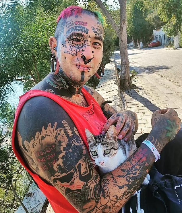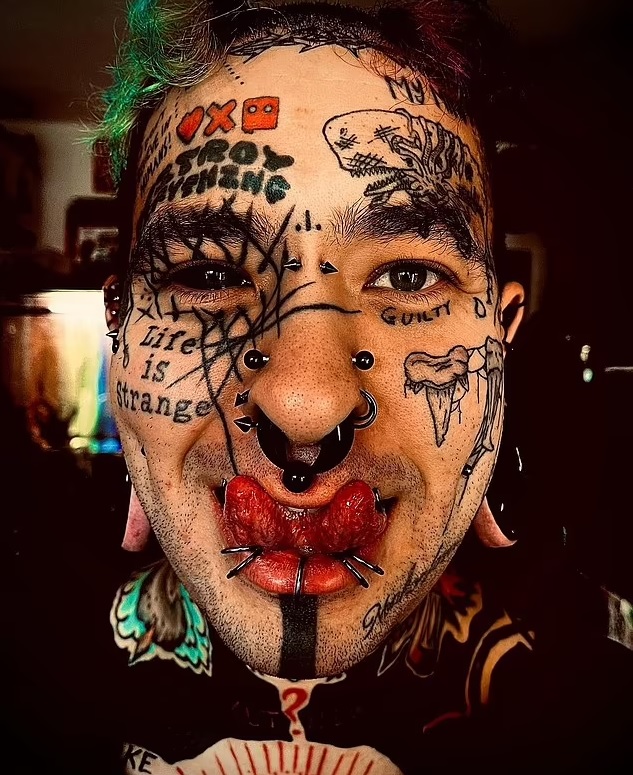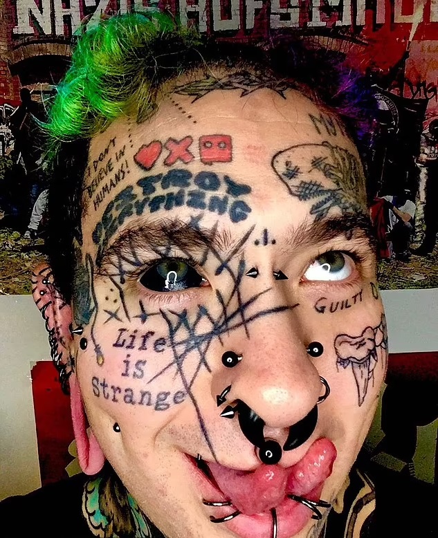 Besides boasting a collection of more than three hundred tattoos, the young man also has a split tongue, an inked eyeball, and dozens of implants, chips, piercings, and even permanent branding.