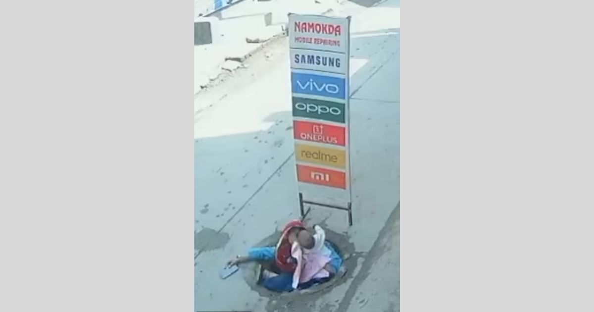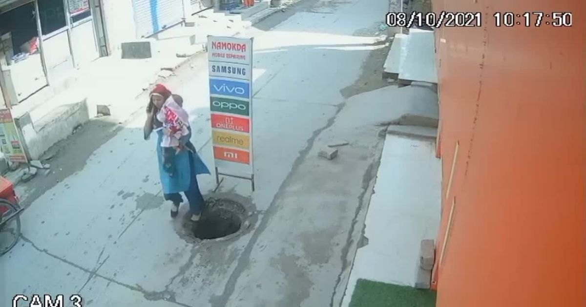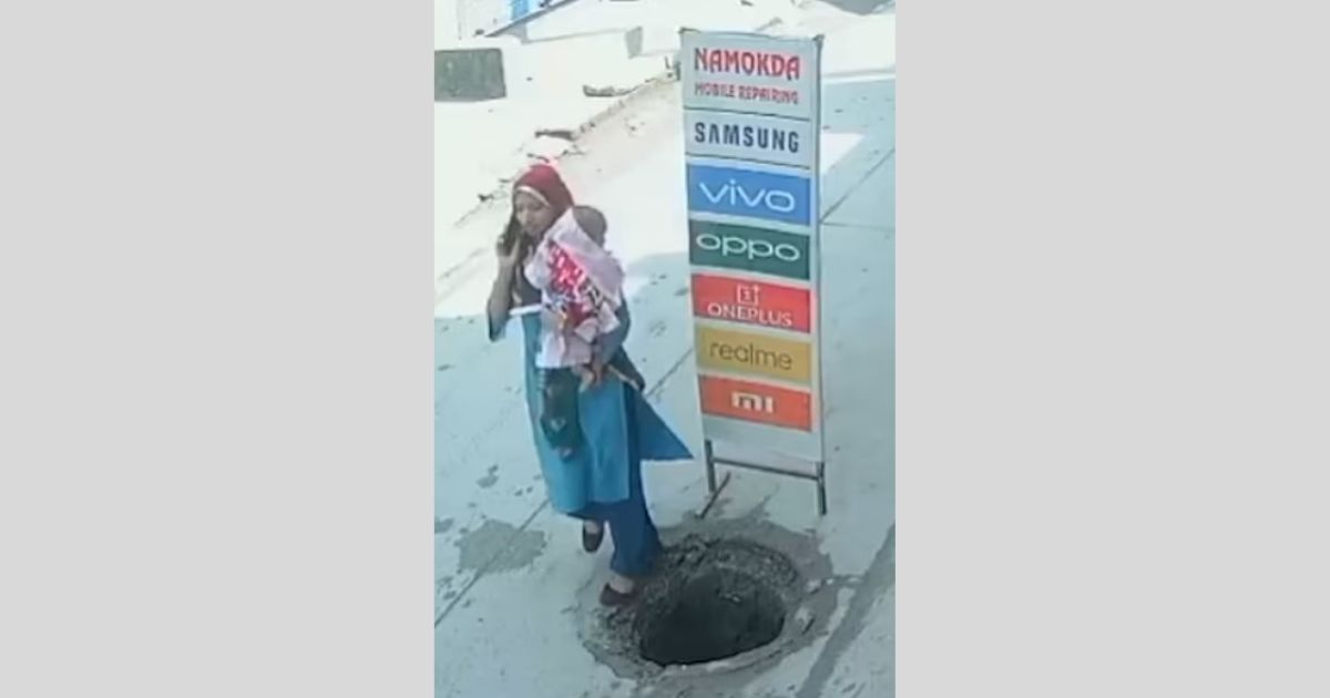In India, a woman and her baby fell into an open manhole after being distracted by her phone.