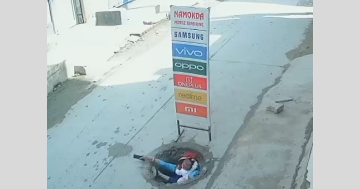 The video also shows the dangerous manhole is partially covered by a tall standing advertorial in front of it.